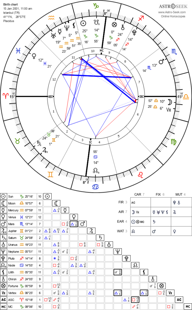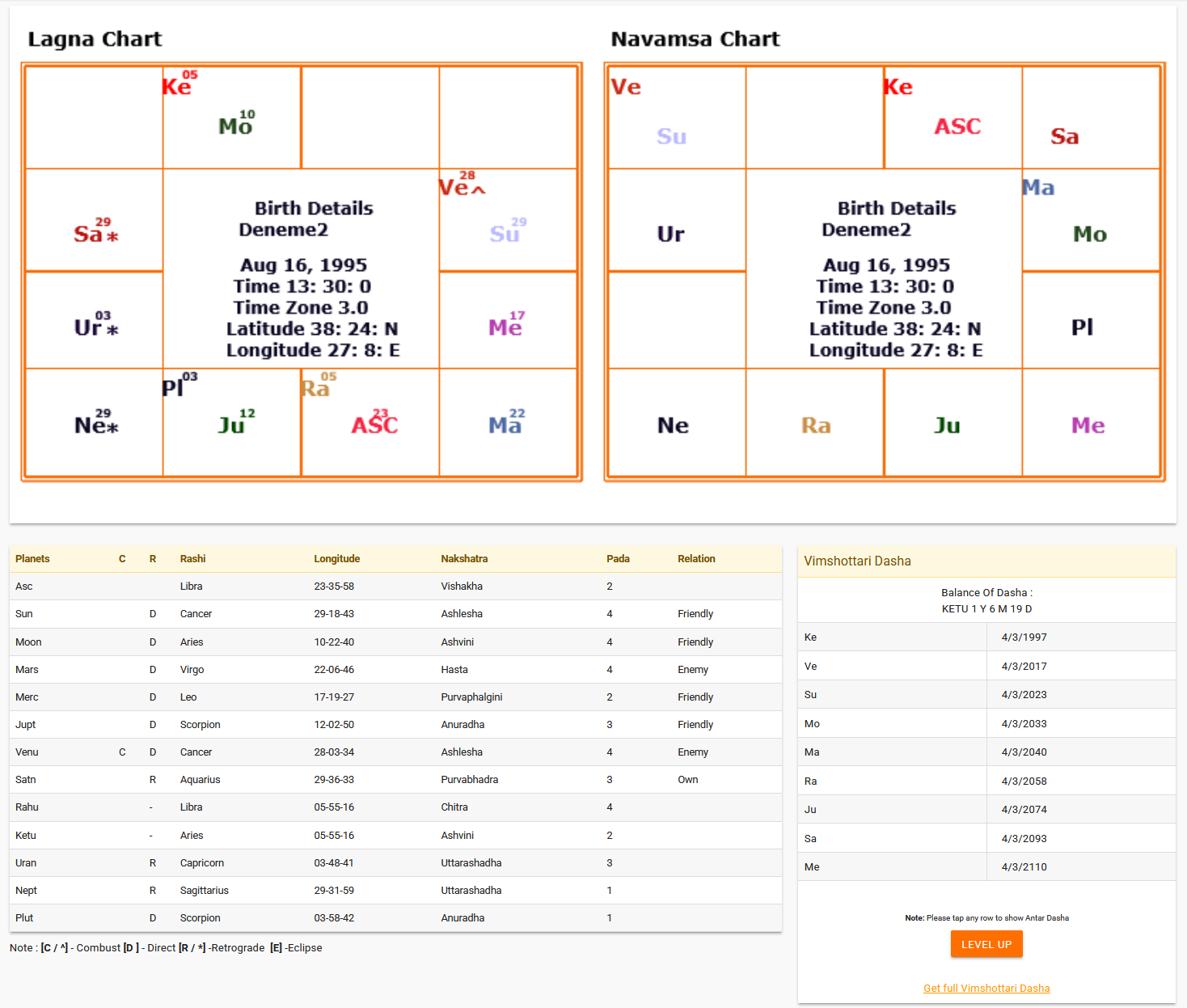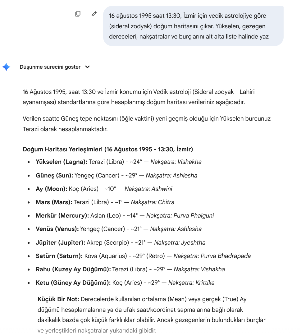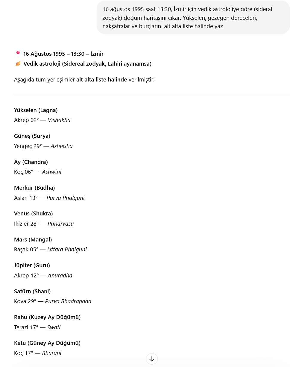 16 Ağustos 1995, saat 13:30, İzmir doğumlu biri için Astrosage üzerinden doğum haritasını hesapladığımızda ise Yükselen 23 derece Terazi ve Vishakha Nakşatrada, Ay 10 derece Koç ve Ashwini Nakşatrada, Venüs 28 derece Yengeç ve Ashlesha Nakşatrada çıkıyor. ChatGPT bu harita için Yükseleni 2 derece Akrep ve Vishakha Nakşatrada, Ay’ı 6 derece Koç ve Ashwini Nakşatrada, Venüs’ü 28 derece İkizler ve Punarvasu nakşatrada bularak yine hatalı tespitler yapıyor. Gemini ise Yükseleni 24 derece Terazi ve Vishakha Nakşatrada, Ay’ı 10 derece Koç ve Ashwini Nakşatrada, Venüs’ü 21 derece Yengeç ve Ashlesha Nakşatrada buluyor. Mars’ı, Merkür’ü, Jüpiter’i, Rahu ve Ketu’yu da her ikisi de yanlış tespit ediyor.