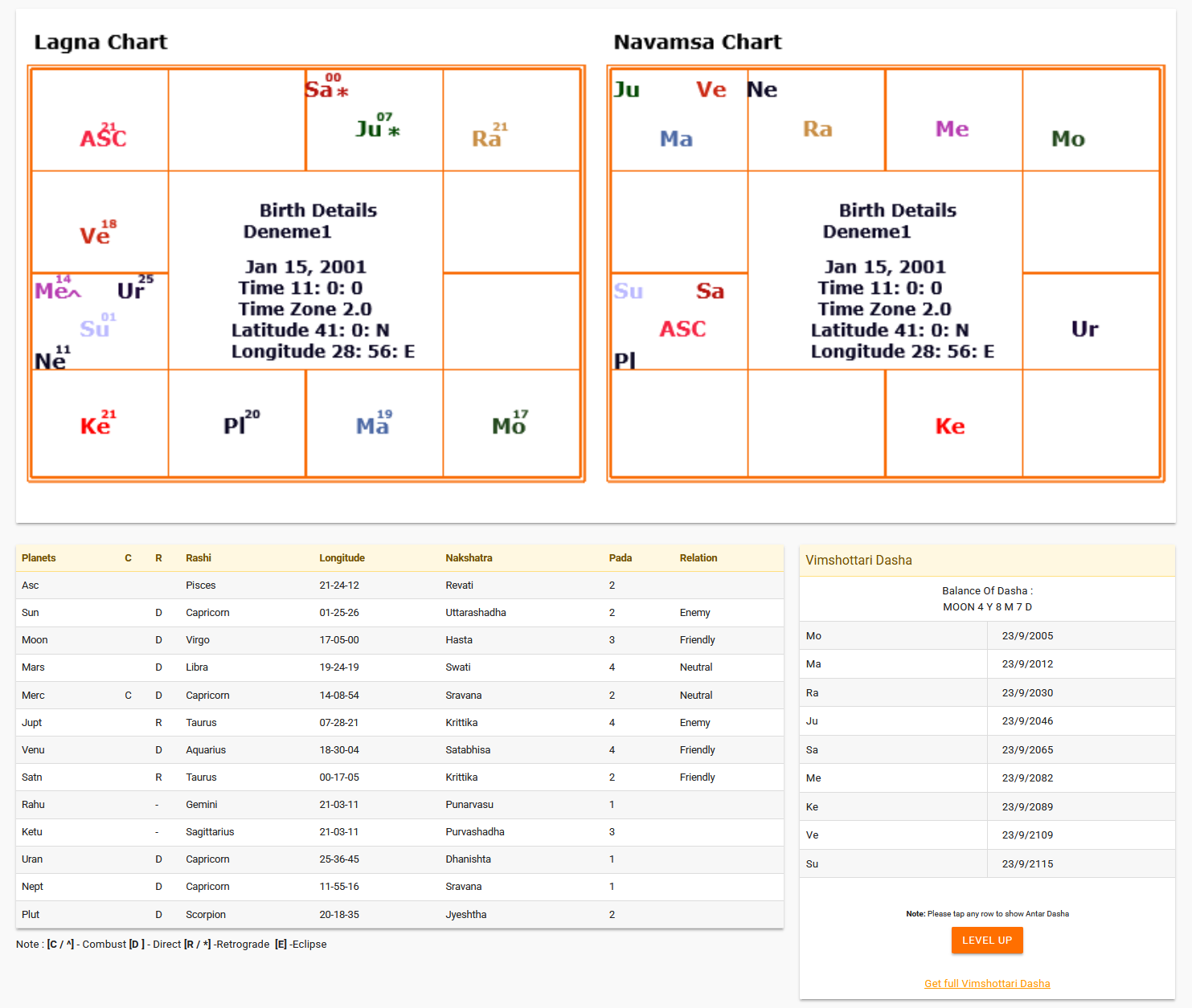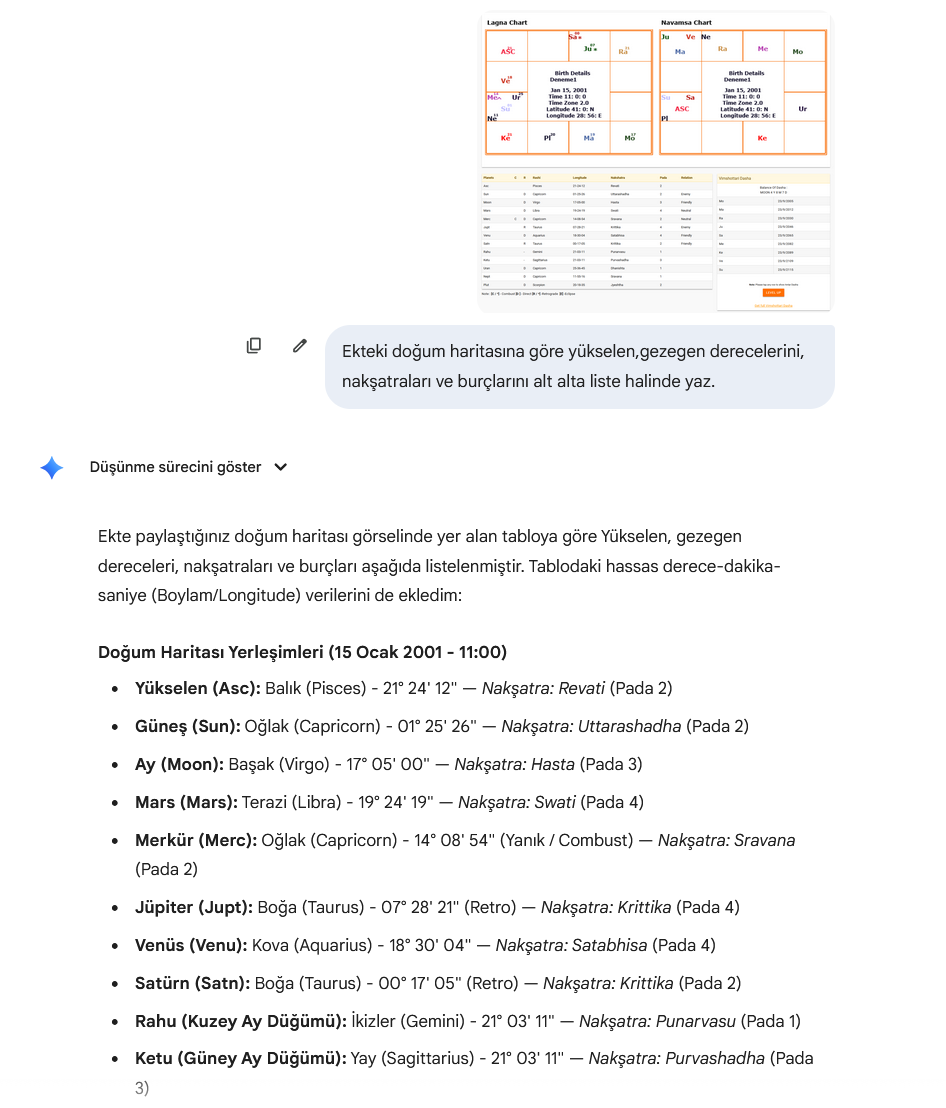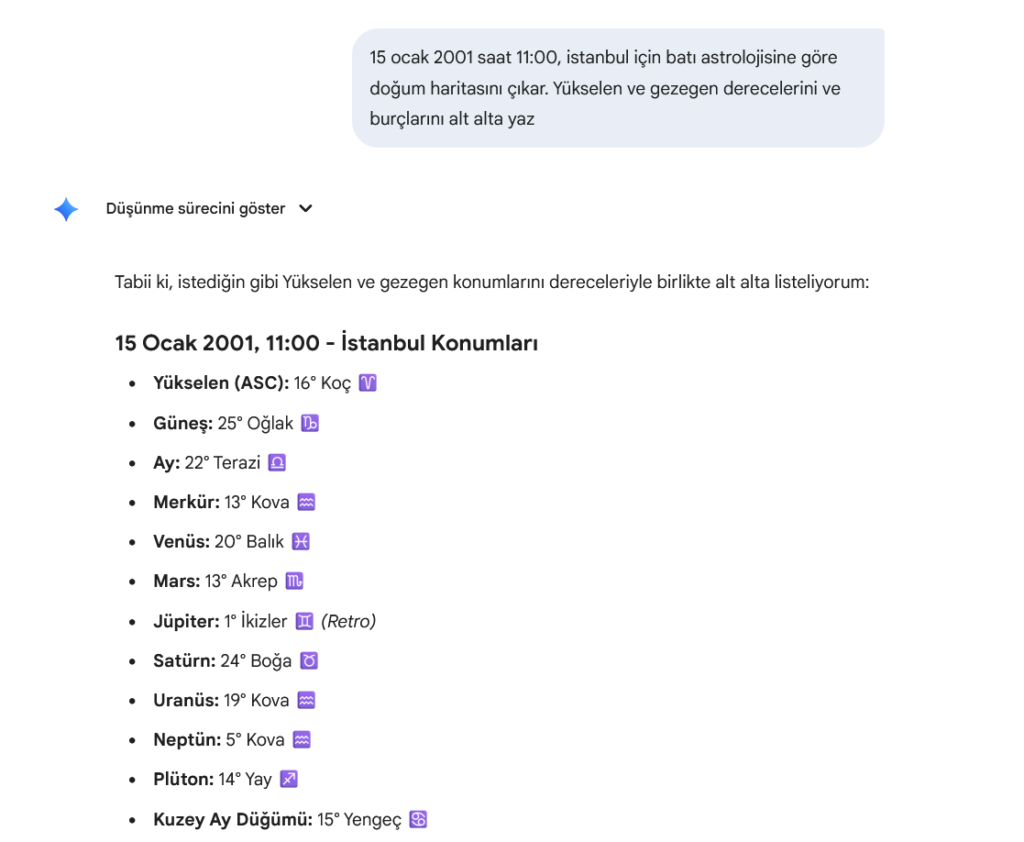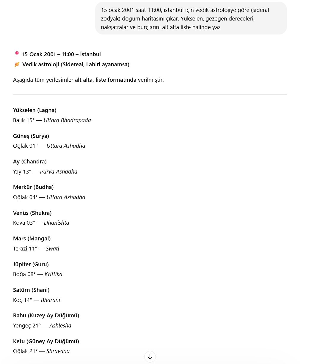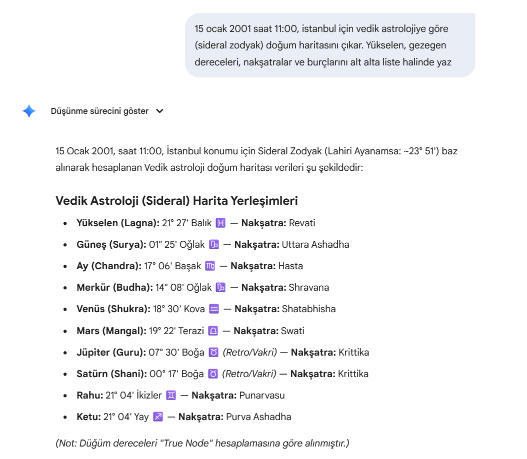 15 Ocak 2001, saat 11:00, İstanbul doğumlu biri için Astrosage üzerinden doğum haritasını hesapladığımızda ise Yükselen 21 derece Balık ve Revati Nakşatrada, Ay 17 derece Başak ve Hasta Nakşatrada, Venüs 18 derece Kova ve Shatabisha Nakşatrada çıkıyor. ChatGPT bu harita için Yükseleni 15 derece Balık ve Uttara Bhadrapada Nakşatrada, Ay’ı 13 derece Yay ve Purva Ashada Nakşatrada, Venüs’ü 3 derece Kova ve Dhanishta nakşatrada bularak oldukça hatalı tespitler yapıyor. Gemini ise Yükseleni 21 derece Balık ve Revati Nakşatrada, Ay’ı 17 derece Başak ve Hasta Nakşatrada, Venüs’ü 18 derece Kova ve Shatabisha Nakşatrada %100 doğrulukta buluyor.