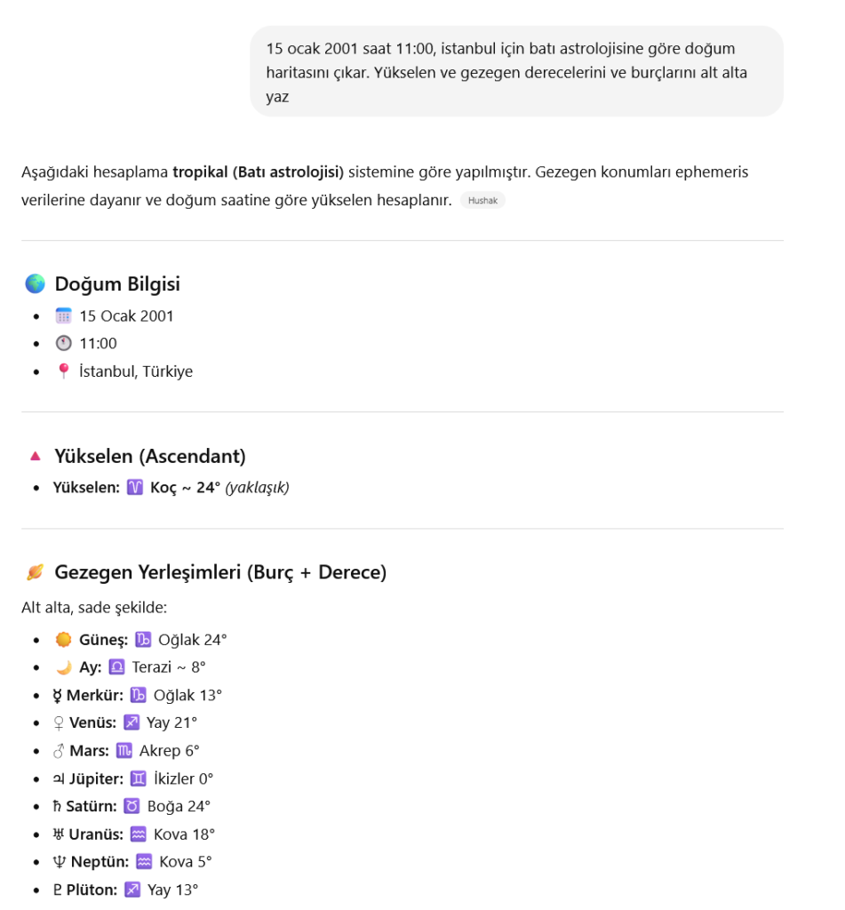 Özel GPT’ler Bile Sınıfta Kalıyor: İşin daha da ilginç tarafı şu; sadece bu iş için özel olarak kodlanmış, mağazalardaki “Astrology GPT” gibi özel araçları da test ettim. Sonuç değişmedi. Bu özel araçlar bile matematiksel hesaplamalarda “halüsinasyon” görüyor ve size ait olmayan bambaşka bir haritayı, son derece özgüvenli bir şekilde size aitmiş gibi sunuyor.