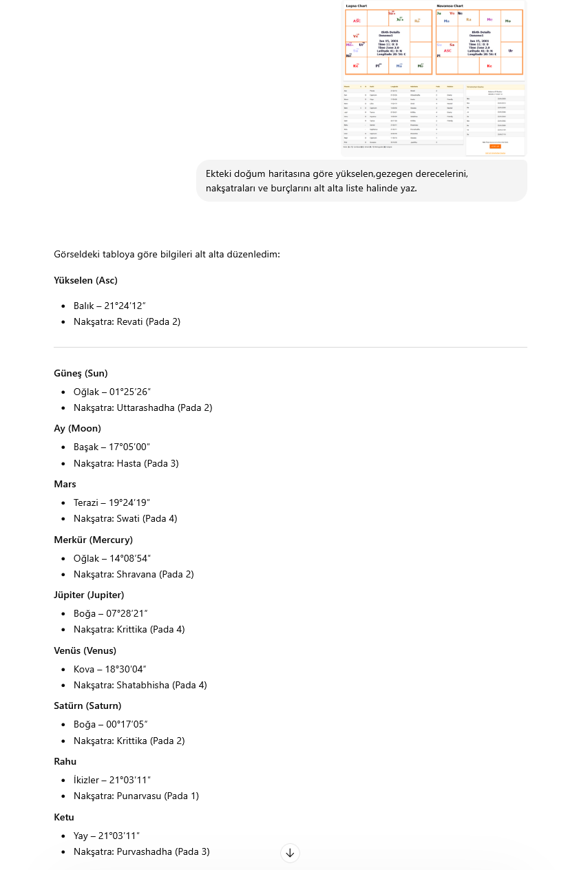 Yapay zekanın bu matematiksel çöküşünü aşmanın tek bir yolu var: Güvendiğiniz bir astroloji programından (JHora, AstroSage, Astroseek vb.) doğum haritanızın ekran görüntüsünü alıp yapay zekaya görsel olarak yüklemek. Yapay zekanın görsel işleme yeteneği muazzamdır. Görüntüyü verdiğinizde haritayı kusursuz bir netlikle tanıyıp, hangi gezegenin nerede olduğunu doğru bir şekilde algılayabiliyor.