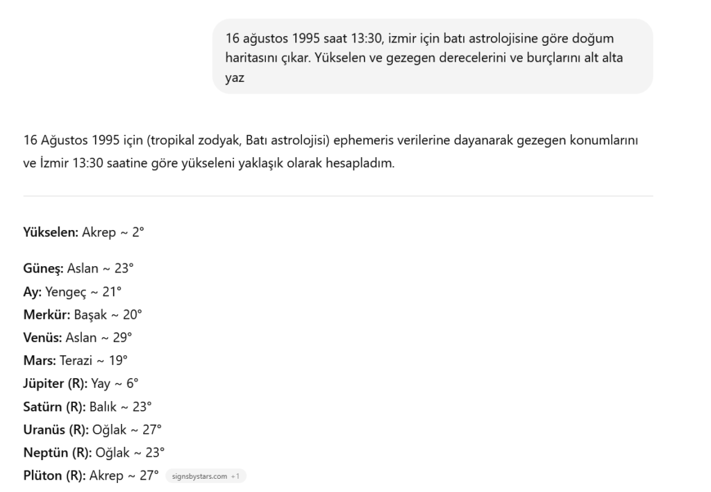 16 Ağustos 1995, saat 13:30, İzmir doğumlu biri için Astroseek üzerinden doğum haritasını hesapladığımızda ise Yükselen 17 derece Akrep, Ay 4 derece Boğa, Venüs 21 derece Aslan çıkıyor. ChatGPT bu harita için Yükseleni 2 derece Akrep, Ay’ı 21 derece Yengeç, Venüs’ü 29 derece Aslan buluyor. Gemini ise Yükseleni 19 derece Akrep, Ay’ı 14 derece Boğa, Venüs’ü 15 derece Aslan buluyor. Yani sonuçlar en yaygın olan Batı astroloji haritalarında bile tutarsız.